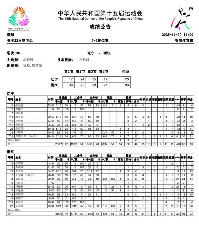 隨著體能的消耗,到瞭第4節,僅7人出戰的遼寧U22男籃就真的跟不上瞭,被浙江隊把分差拉開到瞭20+。最終,遼寧U22男籃以73-93不敵浙江隊,拿到瞭第6名。浙江隊獲得第5名。