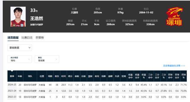 說起王浩然,很多球迷未必認識他,小夥子出生於2001年,在深圳男籃打球,一直都很低調,也沒啥特別搶眼的表現。他在深圳男籃已經打瞭3個賽季,除瞭第一個是賽季隻打瞭1場之外,上賽季和上上賽季才開始成為重要輪轉。尤其是2024-25賽季,王浩然成為深圳隊重要的首發球員,在場均28.3分鐘時間裡,能貢獻11.3分3.5籃板2助攻,投籃命中率45.4%,三分球命中率30.1%。