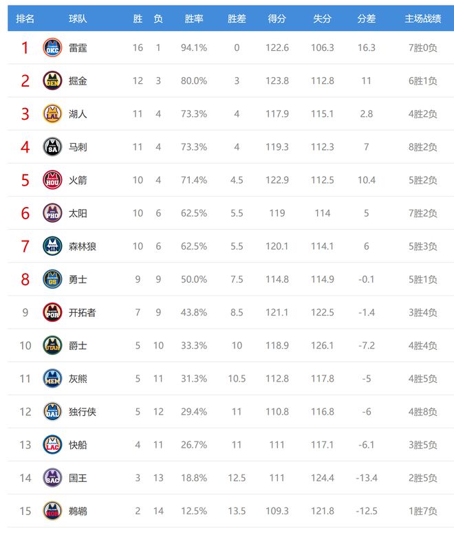 掘金贏球後2連勝,戰績12勝3負穩住西部第二排名,火箭輸球後5連勝終結,戰績10勝4負,排名從西部第三掉到第五,今日沒有比賽的湖人、馬刺坐收好禮,他們排名超過火箭,湖人成為第三,馬刺成為第四。