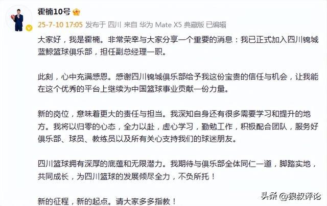 四川男籃副總經理霍楠更新社媒,不僅打破自己已經離開四川男籃俱樂部的傳聞,也對網絡上涉及四川男籃深陷欠薪等事宜做出點評。
