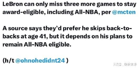 但對於詹姆斯來說,這需要做出很大犧牲,因為前面已經提到,如果詹姆斯背靠背真的缺席那麼多比賽,除瞭全明星資格不受直接影響,除此之外重要獎項,他基本就別想拿瞭。所以若湖人當真如此,就不給詹姆斯背靠背兩場全打,他個人獎項榮譽或許是四大皆空。