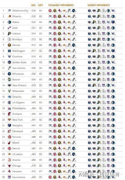 Tankathon的賽程難度統計采用業界公認的科學算法,核心邏輯是通過計算各隊剩餘對手的當前勝率平均值進行排行。簡單來說,若一支球隊此前已與多支高勝率強隊交手,剩餘賽程中遭遇的強敵數量自然減少,難度系數就會降低。