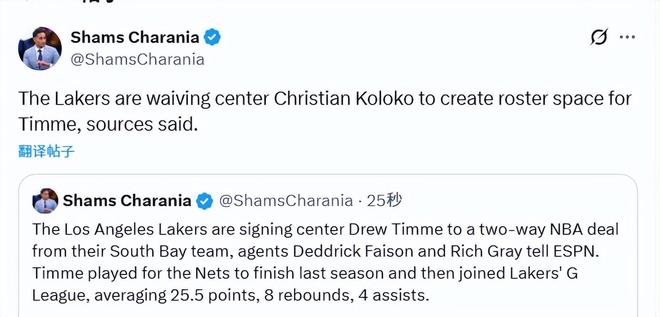 北京時間11月25日,據名記Shams報道,經紀人費森和格雷向ESPN透露,洛杉磯湖人隊將從其發展聯盟附屬球隊南灣湖人隊簽下中鋒德魯-蒂米,雙方達成一份雙向合同。蒂米上賽季末期效力於佈魯克林籃網隊,隨後加入湖人隊發展聯盟球隊,在G聯賽場均貢獻25.5分、8個籃板和4次助攻。為瞭給蒂米騰出陣容名額,湖人裁掉瞭中鋒科洛科。