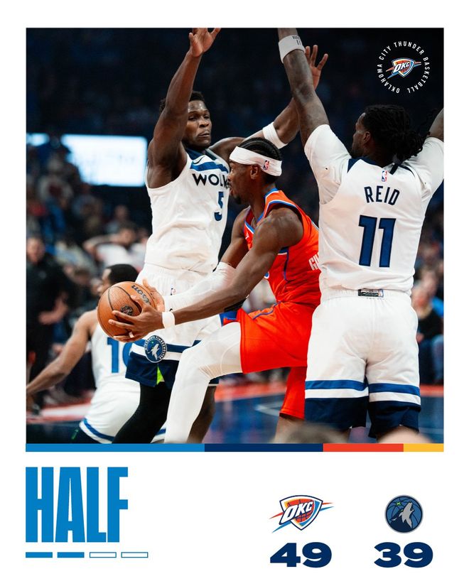 雷霆隊的亞歷山大上半場得到19分、4個籃板和4次助攻;森林狼隊的香農得到10分,愛德華茲得到6分、4個籃板和4次助攻。