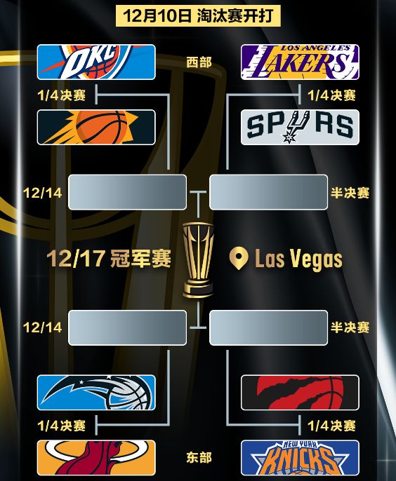 北京時間11月29日,NBA杯小組賽全部結束,八強對陣隨之出爐,西部對陣雷霆vs太陽、湖人vs馬刺,東部對陣魔術vs熱火、猛龍vs尼克斯。西部前六僅掘金與火箭無緣八強,上屆冠軍雄鹿也無緣八強。