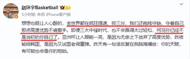 而趙宇環的批評更嚴厲:全世界都在瘋狂提速、投三分,我們還抱殘守缺,守著自己那點高度優勢不肯撒手。即便三大中鋒時代,也不會贏得太過輕松,何況你已經不是當初的你自己瞭。