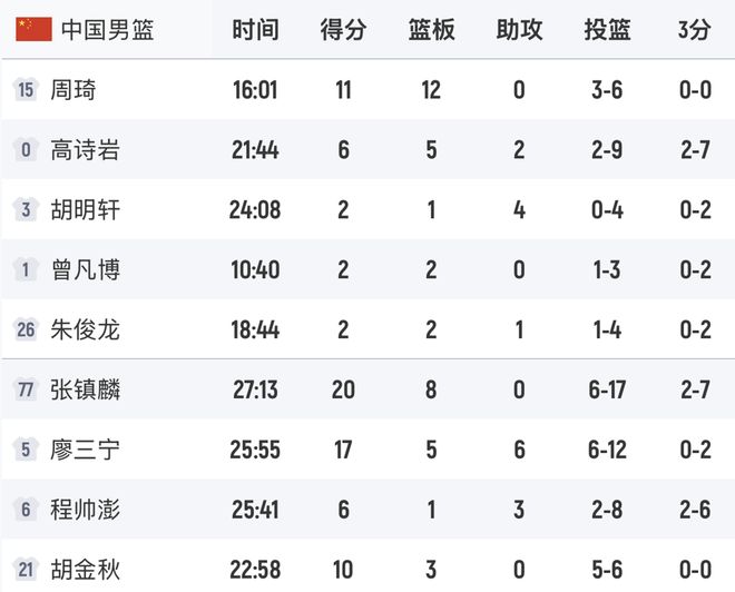 在首發陣容中,胡明軒4中0依靠罰球得2分,曾凡博3中1也是2分,另外朱俊龍投籃4中1同樣隻有2分進賬。中國隊的這3名先發隊員打出這樣的數據,輸球也正常。