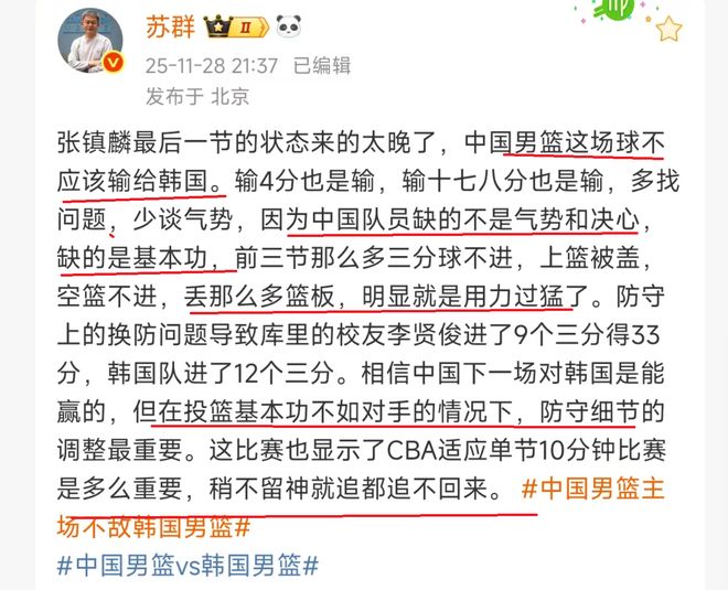 輸韓國4分!蘇群中肯點評,指出瞭中國男籃輸球的主要原因