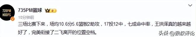 過去3場CBA杯賽,王洪澤,場均10.6分5.6籃板2助攻,17投12中,七成命中率,王洪澤真的越來越好瞭,完美銜接瞭二飛離開的位置空檔。