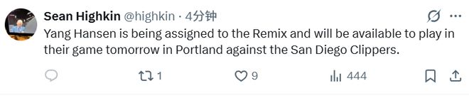 北京時間12月4日,據開拓者隊記Sean Highkin報道,楊瀚森被開拓者下放到發展聯盟下屬的混音隊,將可以出戰明日混音對陣聖迭戈快船的比賽。