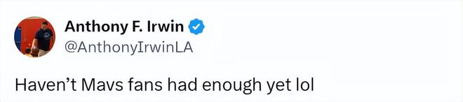 看著獨行俠兩位舊將同時當選周最佳,名記Irwin調侃獨行俠球迷應該受夠瞭。