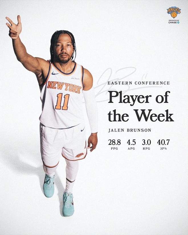 過去一周,佈倫森場均28.8分4.5助攻,三分命中率40.7%,率領尼克斯取得4勝0負的佳績。