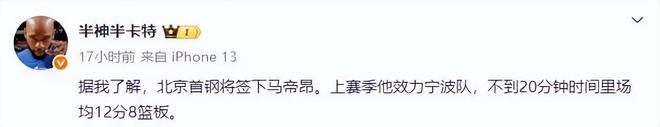 北京男籃是新賽季的爭冠熱門之一,球隊已經舉辦瞭新賽季的出征儀式,無論是主教練許利民還是隊長翟曉川,都明確表示新賽季的唯一目標就是爭冠。在球隊的陣容方面,北京男籃正在尋找第四外援,很多北京球迷對此非常關註。就在日前,這件事有瞭確定的消息,據媒體人“半神半卡特”透露,北京男籃即將和外援芒格-馬帝昂完成簽約。