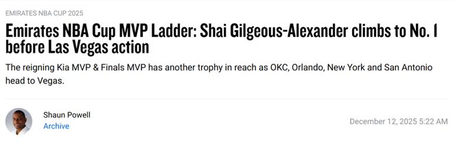 北京時間12月13日,隨著NBA杯四強的產生,NBA官網也更新瞭杯賽MVP的排行榜。雷霆球星亞歷山大升至第一,尼克斯球星佈倫森排名第二。上期排名第一的東契奇,由於湖人已經被淘汰,他的排名也跌至第七。以下是具體排名——