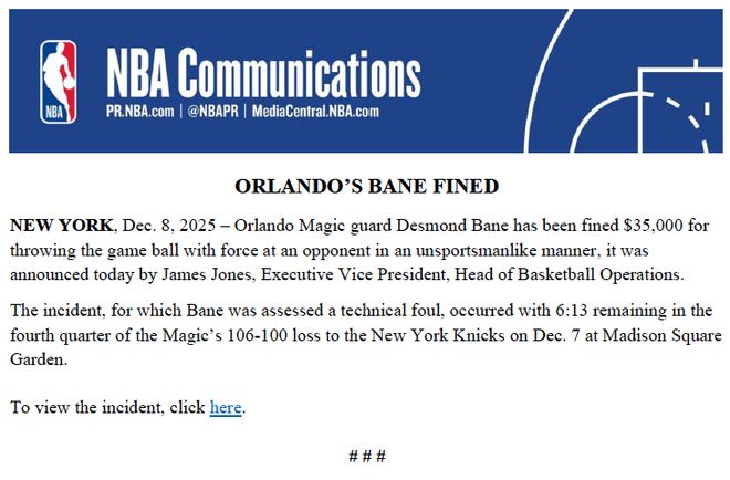 北京時間12月9日,NBA官方公佈罰單,魔術後衛貝恩被罰款35000美元。NBA籃球運營執行副總裁詹姆斯-瓊斯今日正式宣佈,貝恩因以非體育道德行為用力將比賽用球砸向對手(阿奴諾比),被處以35000美元罰款。