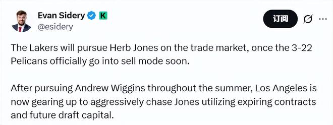 北京時間12月11日,據NBA名記Sidery報道,一旦目前戰績僅為3勝22負的鵜鶘隊正式開啟甩賣模式,湖人便會在交易市場上追求赫伯特-瓊斯。經過休賽期對維金斯的持續追逐後,湖人如今正籌備利用到期合同和未來選秀權,全力出擊追逐瓊斯。