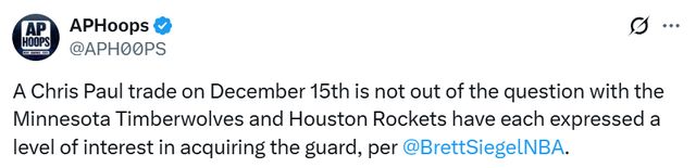 北京時間12月12日,據名記Siegel在播客節目上透露,12月16日完成克裡斯-保羅的交易並非不可能——明尼蘇達森林狼隊與休斯頓火箭隊均已表達瞭對這位後衛的興趣。