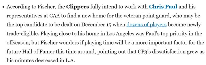 Fischer表示,快船方面計劃全力配合保羅及其在CAA經紀公司的團隊,為這位老將控衛尋找新東傢。6天後,也就是北京時間12月16日,將有數十名球員解鎖交易資格,保羅預計會成為屆時頭號被交易人選。