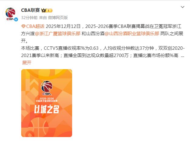 北京時間12月13日,CBA官方公佈2025-26賽季揭幕戰的收視情況,央視直播收視率創20-21賽季後近5年新高,全國觀眾人數超2700萬,市場份額創近18年新高,而抖音直播總直播觀看人次5001萬。