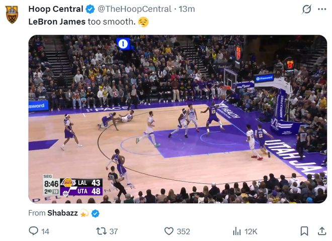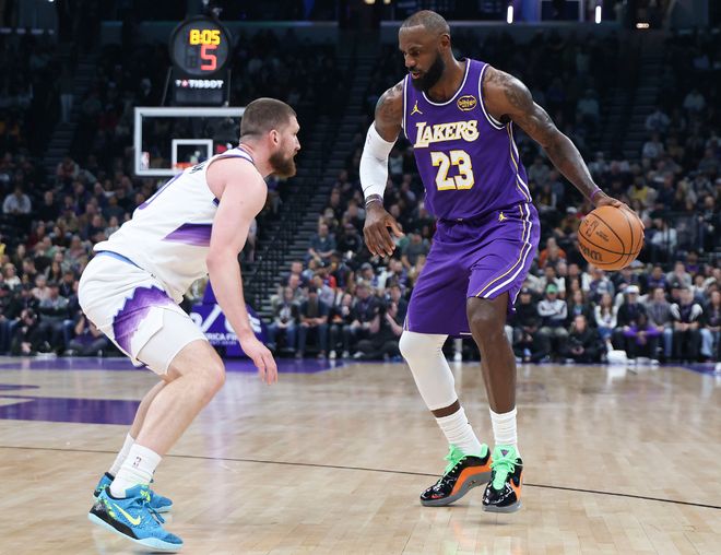 北京時間12月19日,湖人以143-135擊敗爵士拿到二連勝。這場比賽僅差11天就年滿41歲的勒佈朗出現瞭驚魂一幕,他被克萊頓撞到膝蓋,短暫倒地的勒佈朗起身繼續鏖戰,下半場更是隔扣菲利波夫斯基,全場比賽28+10+7誰說老頭子已經暮年?