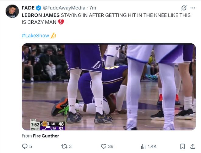 詹姆斯痛苦倒地,他在地板上嘗試膝蓋的感覺,隨後詹姆斯起身後繼續鏖戰,美記寫道:詹姆斯的膝蓋遭遇瞭如此沖撞還能留在場上,這太瘋狂瞭,為他心碎。