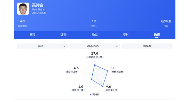 至於高詩巖,兩輪過後,他的場均數據是4.5分9助攻3搶斷,投籃命中率25%,三分命中率16.7%。該表現直觀體現出瞭他缺乏攻框、投籃能力,但防守積極的特點。