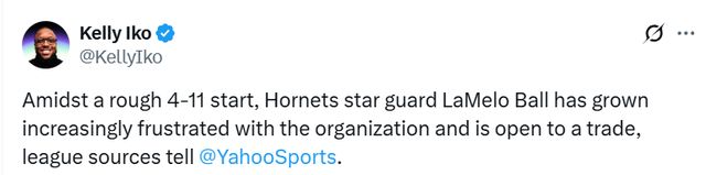 北京時間11月21日,據名記Iko報道,多位聯盟消息人士透露,在黃蜂隊客場令人失望地不敵僅2勝13負的步行者隊後(遭遇四連敗,戰績跌至4勝11負,排名東部第12位),明星後衛拉梅洛-鮑爾(三球)對球隊的不滿情緒日益加劇,並且願意被交易離隊。