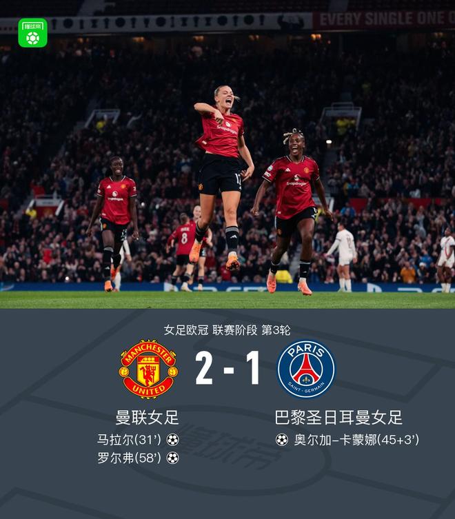 北京时间11月13日女足欧冠 联赛阶段 第3轮,曼联女足对阵巴黎圣日耳曼女足。曼联女足马拉尔破门,罗尔弗破门。巴黎圣日耳曼女足奥尔加-卡蒙娜破门。最终比分曼联女足 2-1 巴黎圣日耳曼女足。曼联女足取