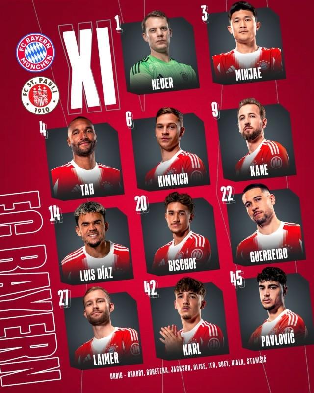 北京时间11月29日22:30,德甲第12轮,拜仁慕尼黑主场迎战圣保利。拜仁公布首发,劳模凯恩领衔锋线,迪亚斯先发,奥利塞轮休。与帕梅卡诺缺席最终名单,官方给出的理由是“管理身体负荷”。 拜仁慕尼黑首发(4231):诺伊尔/莱默、若纳唐·塔、金玟哉、比朔夫/基米希、帕夫洛维奇/伦纳特·卡尔、格雷罗、路易斯·迪亚斯/凯恩 替补:乌尔比希、格纳布里、格雷茨卡、尼古拉斯·杰克逊、奥利塞、伊藤洋辉、博埃、斯塔尼希奇、基亚拉