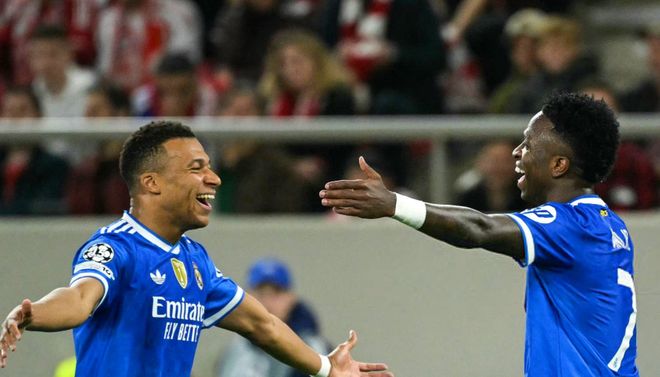 下半场易边再战。第52分钟,皇马丢球了。塔雷米抢点头球顶进。5分钟后,维尼修斯突入禁区后的射门被挡出。第59分钟,维尼修斯在边路突破,随即送出倒三角回传球,姆巴佩直接推射破门,完成大四喜!第81分钟,奥林匹亚科斯再次缩小差距。卡埃比头球顶进!之后卡埃比的射门踢偏,错失了绝平的机会。最终,皇马4-3险胜奥林匹亚科斯。姆巴佩5场欧冠打进9球,刷新个人单赛季欧冠进球纪录。