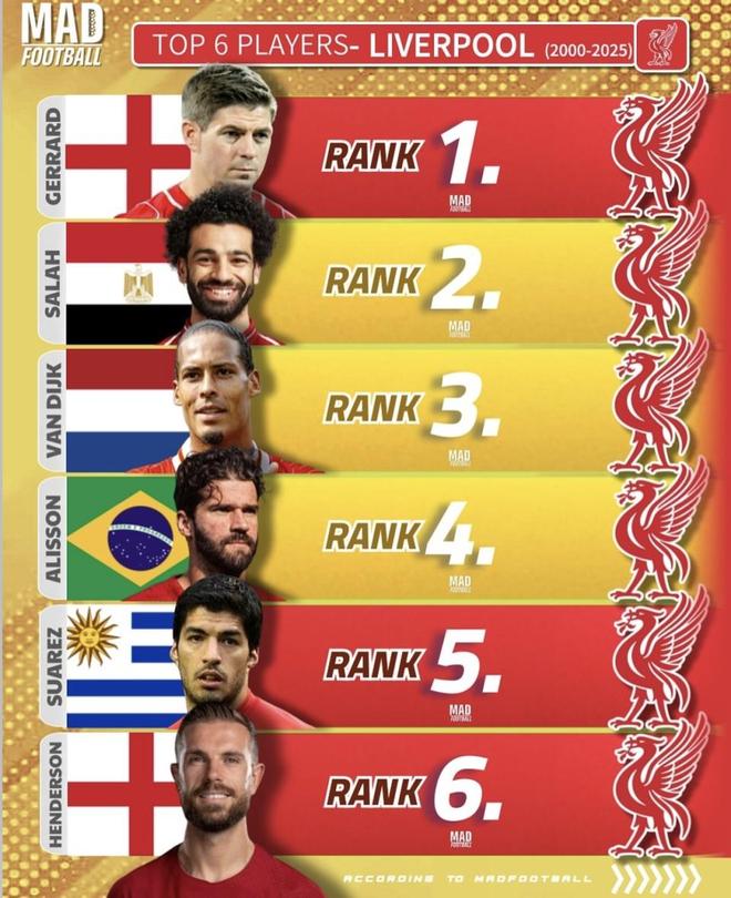 最近MAD FOOTBALL發佈瞭“2000–2025利物浦最佳6人”。傑拉德、薩拉赫、范戴克等球員入選。馬內、菲爾米諾遺憾落榜。爭議主要集中在頭名與第六位。