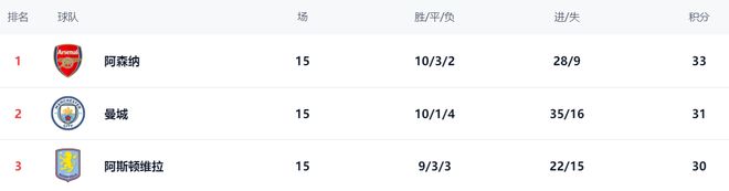 隨著這一輪曼城大勝桑德蘭,阿森納輸給阿斯頓維拉,導致英超爭冠形勢大變。曼城總積分達到31分,排名第2,隻比榜首的阿森納少2分。而第3名的維拉也隻比阿森納少3分。