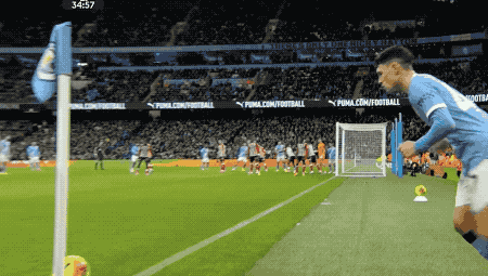 第34分鐘,福登開出角球,格瓦迪奧爾高高躍起,頭槌破門。短短的3分鐘,曼城連進兩球。
