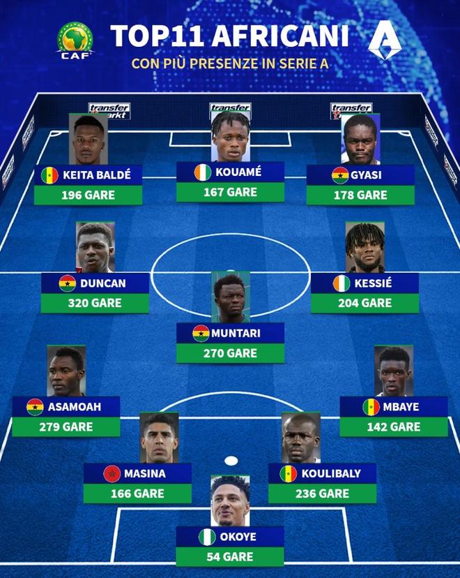 德轉列意甲出場數最多的非洲球員11人陣容: