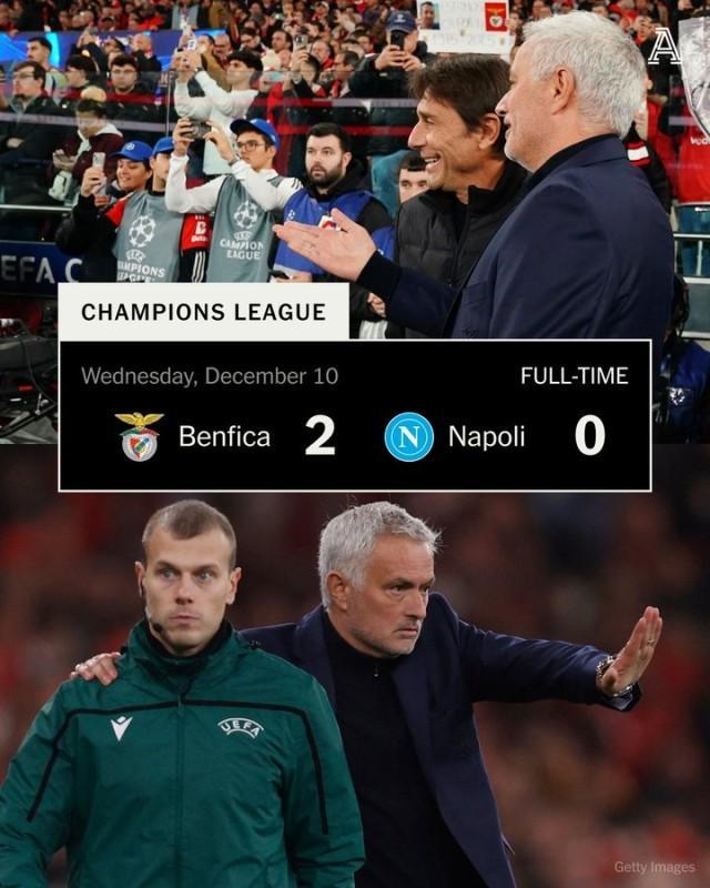 歐冠聯賽階段第6輪,本菲卡主場2比0那不勒斯,第20分鐘裡奧斯首開紀錄,第49分鐘巴雷羅鎖定勝局。本菲卡歐冠2連勝,距離附加賽區域僅1分。那不勒斯6輪歐冠3負,全是客場,隊史首次歐冠客場5連敗。 孔蒂把輸球歸咎於一周雙賽造成的傷病和疲勞,指出本菲卡休息時間更足,“如果連續六周三天一賽,肯定會付出代價……我們就像一臺需要時間預熱的柴油發動機。”穆裡尼奧不以為然:“說本菲卡體能更好,感覺像是在找借口。”他認為自己的戰術變化才是取勝關鍵。