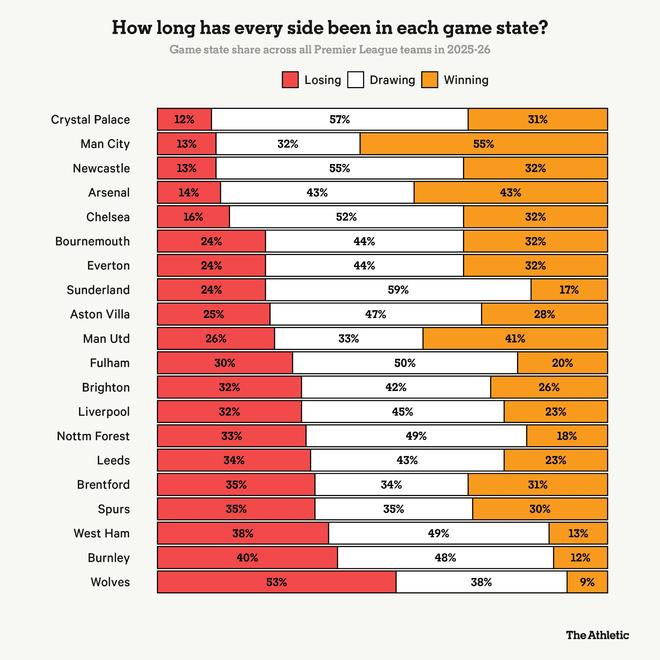 利物浦本賽季有32%的英超比賽時間處於落後追趕狀態,是曼城或阿森納所占時間比例的兩倍多。正如斯洛特指出的,這改變瞭他們的戰術打法。