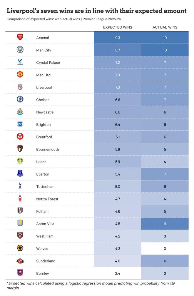 上表的排序與幾傢知名數據機構生成的預期積分排名大致吻合。這些有助於將利物浦的xG主導地位置於具體情境中,並解釋為何這沒有轉化為更高的聯賽排名。
