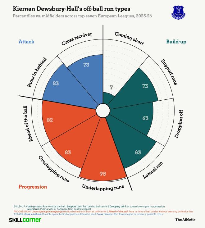 下圖使用SkillCorner數據,展示瞭迪尤斯伯裡-霍爾的無球跑動。