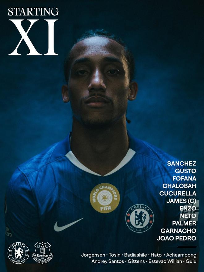 切爾西首發:1-桑切斯、27-古斯托、29-福法納、23-查洛巴、3-庫庫雷利亞、24-裡斯-詹姆斯、8-恩佐-費爾南德斯、7-內托、10-帕爾默、49-加納喬、20-若昂-佩德羅