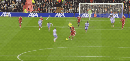 上場不到1分鐘,薩拉赫就在熟悉的右路送出妙傳,麥卡利斯特順勢傳中,門將搶在埃基蒂克之前,將球沒收。