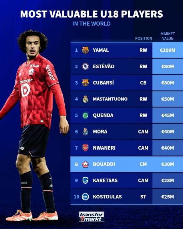 U18球员身价榜:亚马尔2亿欧居首,埃斯特旺、库巴西8000万欧