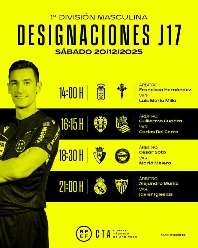 西班牙足协公布了联赛第17轮第2比赛日的裁判名单,穆尼斯执法皇马vs塞维利亚。皇家奥维耶多vs塞尔塔主裁判:弗朗西斯科-埃尔南德斯VAR:路易斯-马里奥-米拉莱万特vs皇家社会主裁判:吉列尔莫-夸德拉