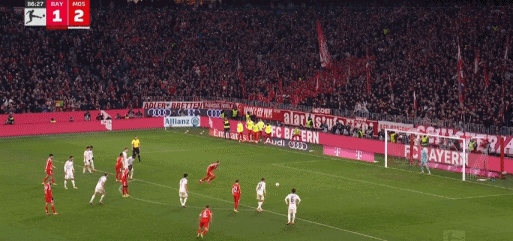 第45+2分钟,伯温开出任意球,波图尔斯基头球破门,美因茨1-1拜仁