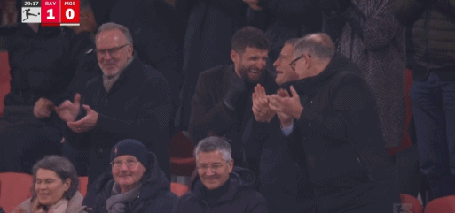 第29分钟,拜仁进球后镜头给到看台,穆勒和高层一起庆祝