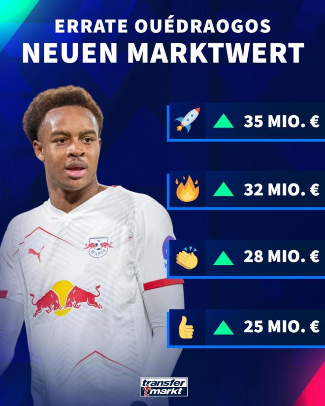 德转即将对德甲球员的身价进行更新。今日德转预热莱比锡新星韦德拉奥果身价,球员最多上涨2500万欧达到3500万欧。
