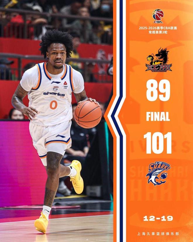 北京時間12月19日,CBA常規賽第3輪,客場作戰的上海久事男籃以101比89戰勝江蘇肯帝亞男籃,後者遭遇聯賽三連敗。另一場比賽中,主場作戰的廣東東陽光以97比94擊敗廣州朗肽海本,取得三連勝。