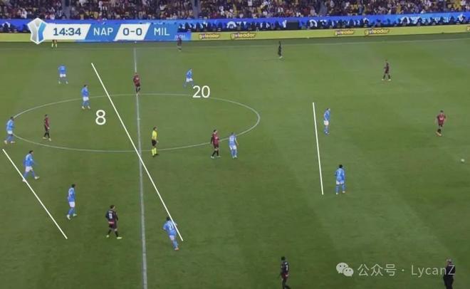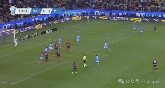 對手隻用霍伊倫和麥克托米奈兩人就把米蘭五個防守人員牽制在禁區內,原本跟防迪洛倫佐的拉比奧特也因為內雷斯的內切轉為協防站位。於是那不勒斯隊長空出來瞭,弧頂的埃爾馬斯無人限制,波利塔諾在輕松插上。