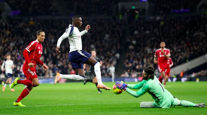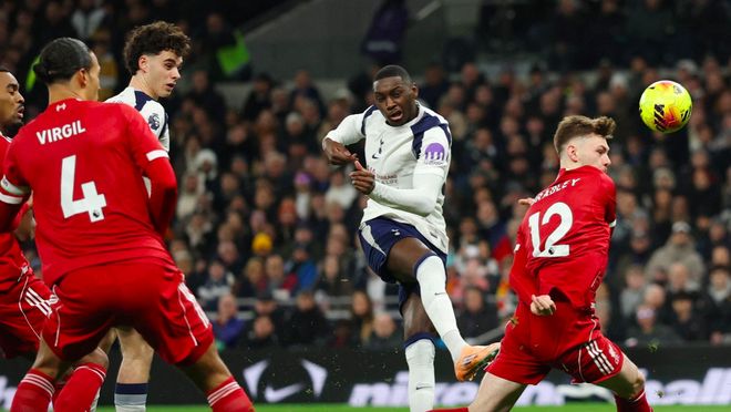 第64分鐘,熱刺差點扳平比分,穆阿尼的傳中越過阿利松的頭頂,擊中橫梁彈瞭出來。